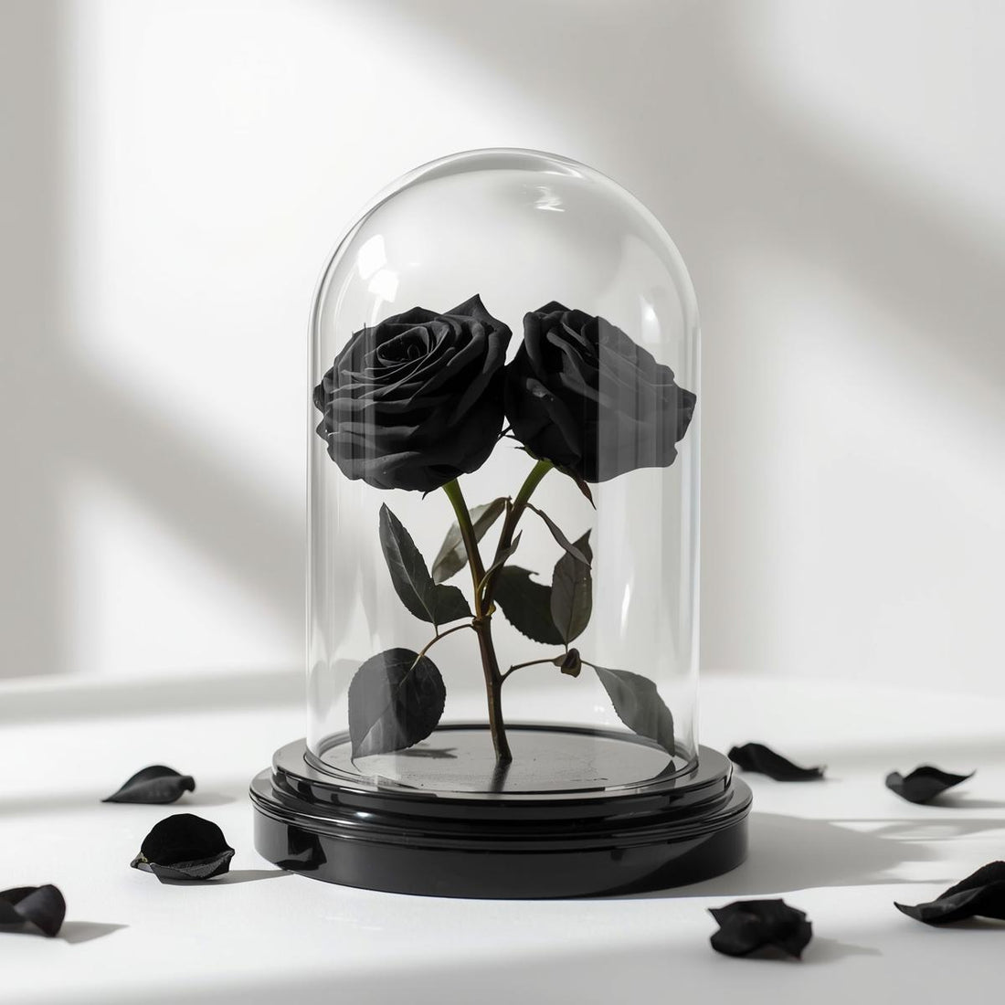 duo preserved black roses displayed in a glass dome — an eternal keepsake.