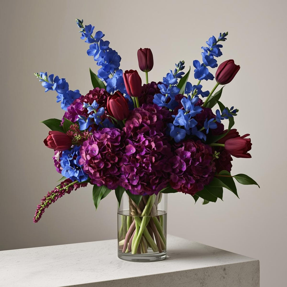 12 purple hydrangeas, 9 burgundy tulips, and 5 blue mathiolas arranged in a clear glass...