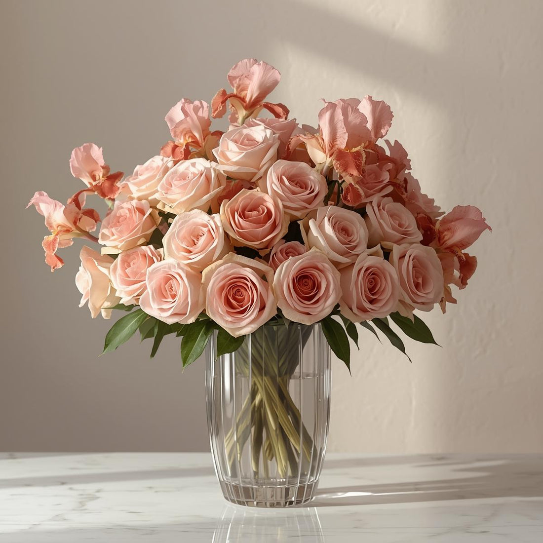 20 coral hydrangeas and 5 ivory lilys arranged in a clear glass vase.