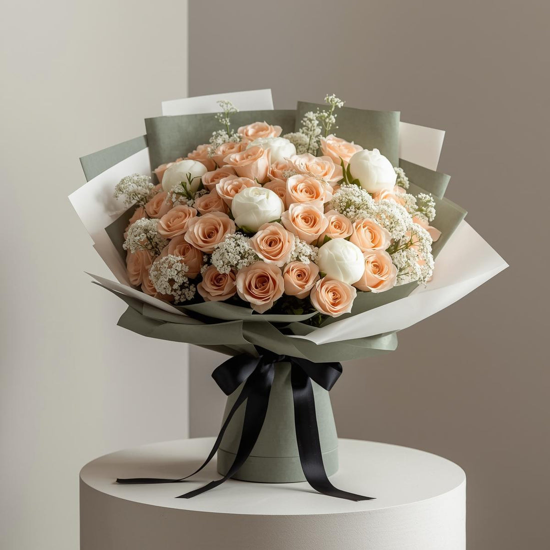 25 peach roses with 10 white peonys and 5 stems of gypsophila, wrapped in matted...