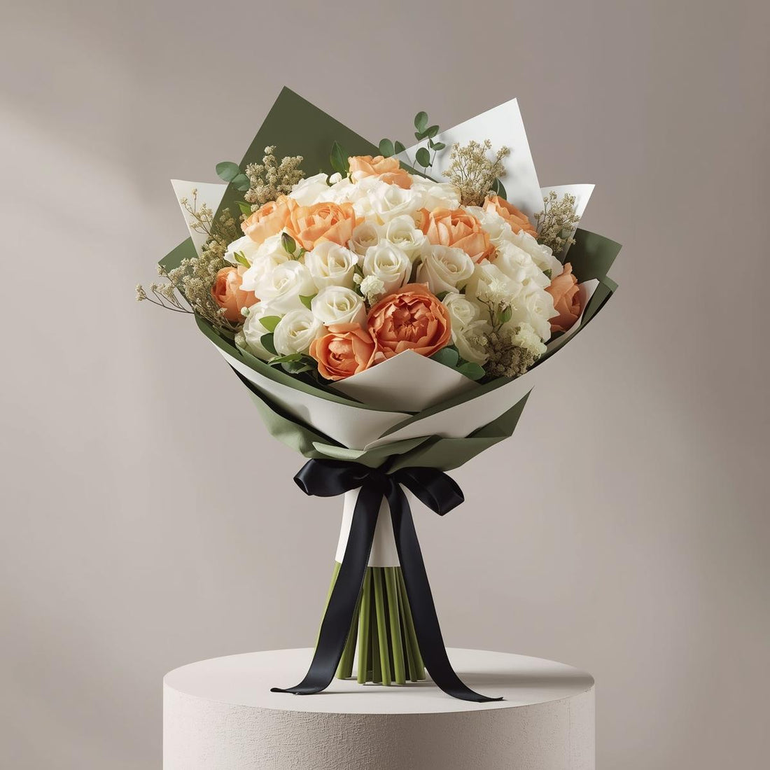 50 white roses with 10 orange peonys and 5 stems of limonium, wrapped in matted...