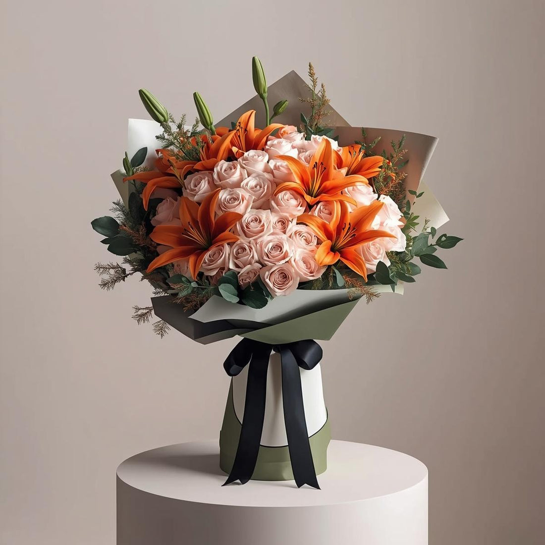 40 pink roses with 10 orange lilys and 5 stems of greenery, wrapped in matted...