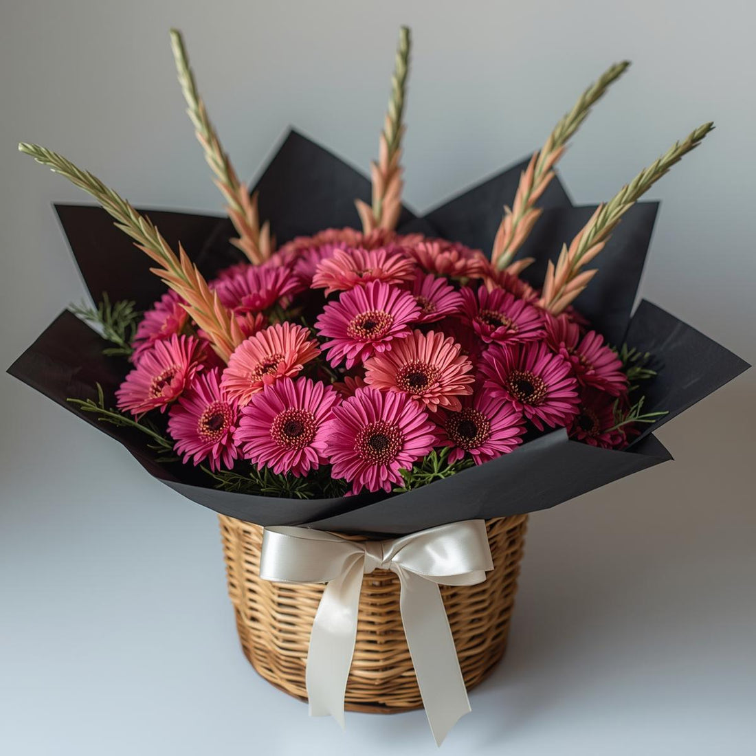 Woven basket with 12 fuchsia chamomiles and 5 peach greenerys, finished with matted black paper...