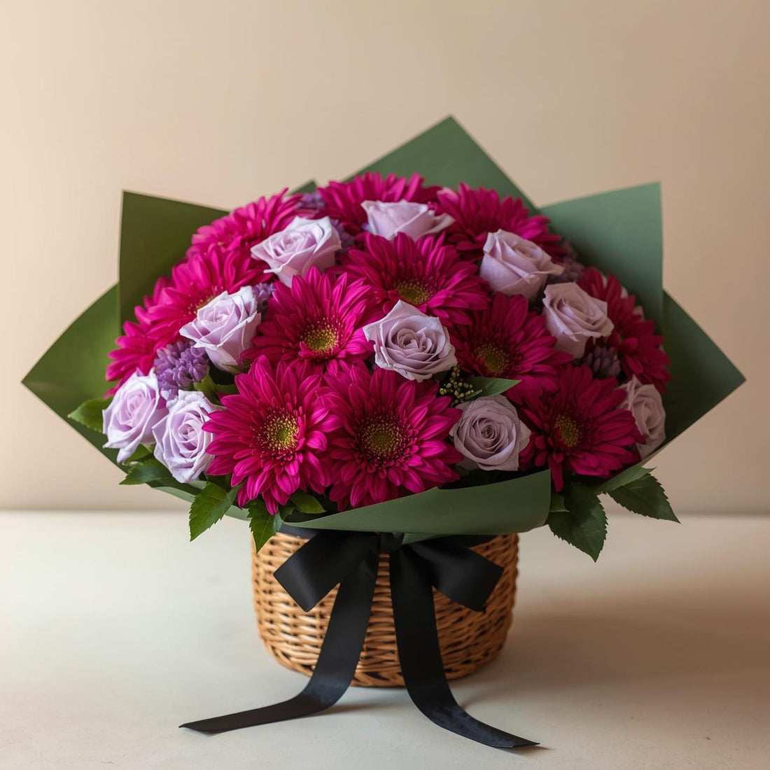 Woven basket with 14 fuchsia chrysanthemums and 8 lavender baby roses, finished with matted green...