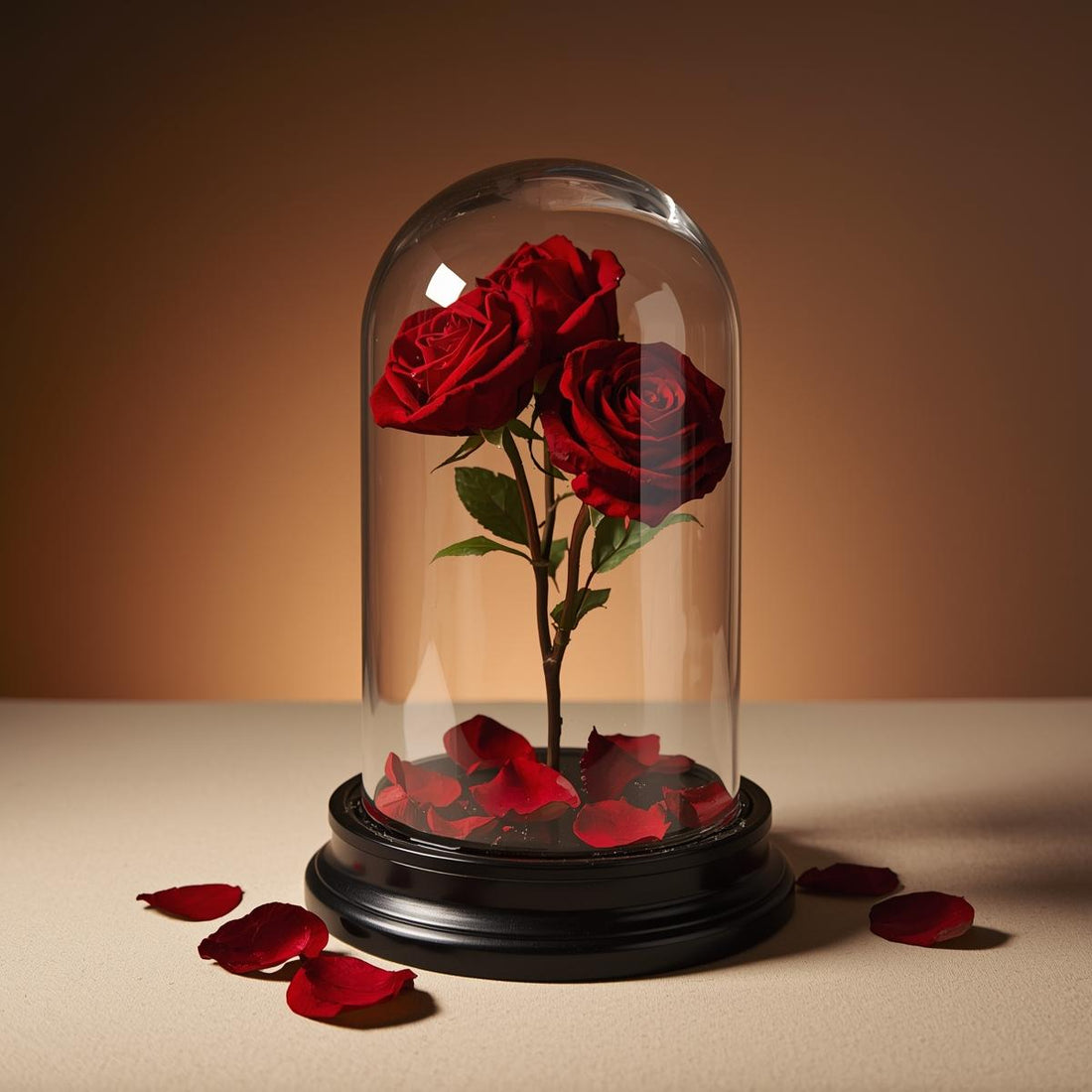 duo preserved red roses displayed in a glass dome — an eternal keepsake.