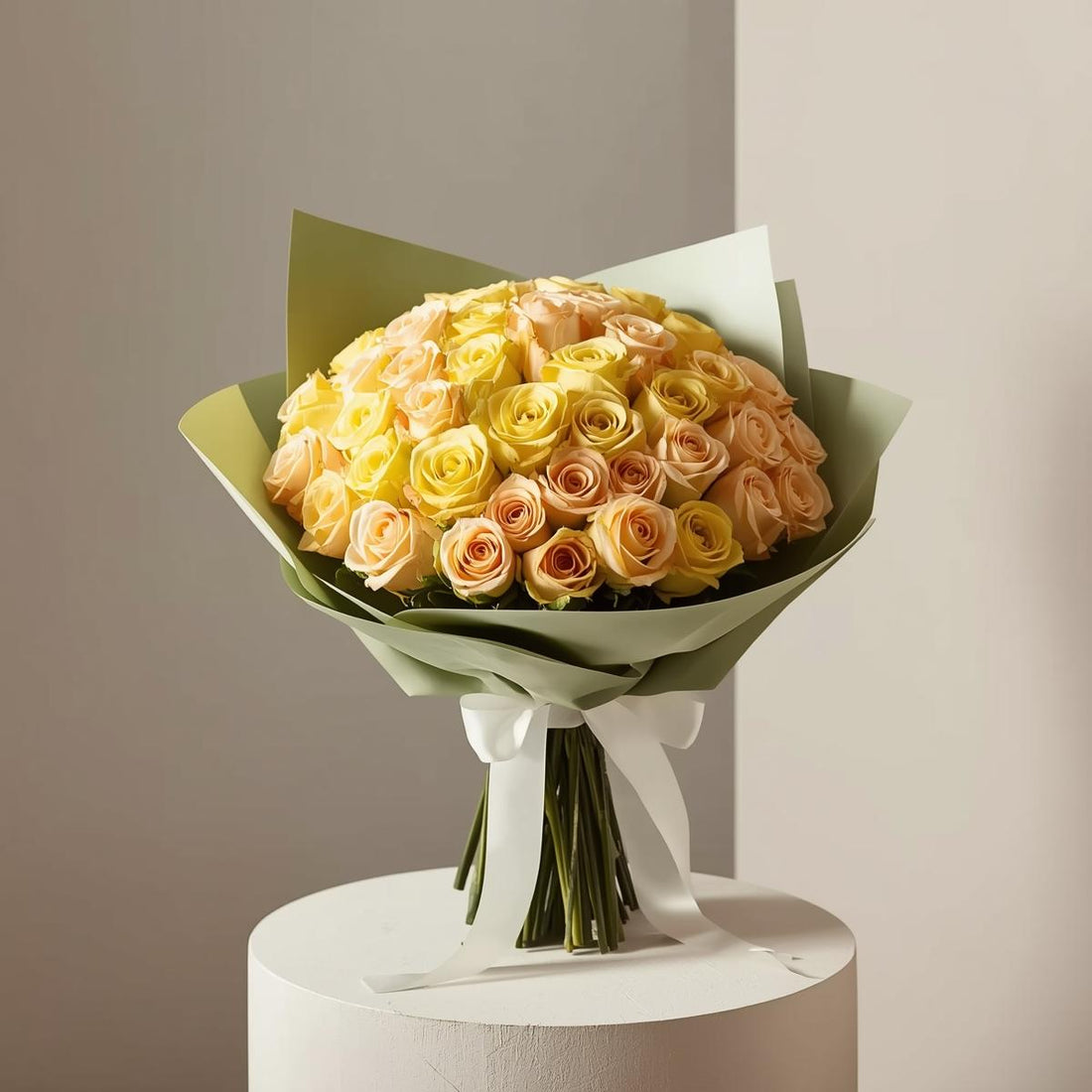 50 mixed roses (yellow and peach) wrapped in matted green and white paper with white...