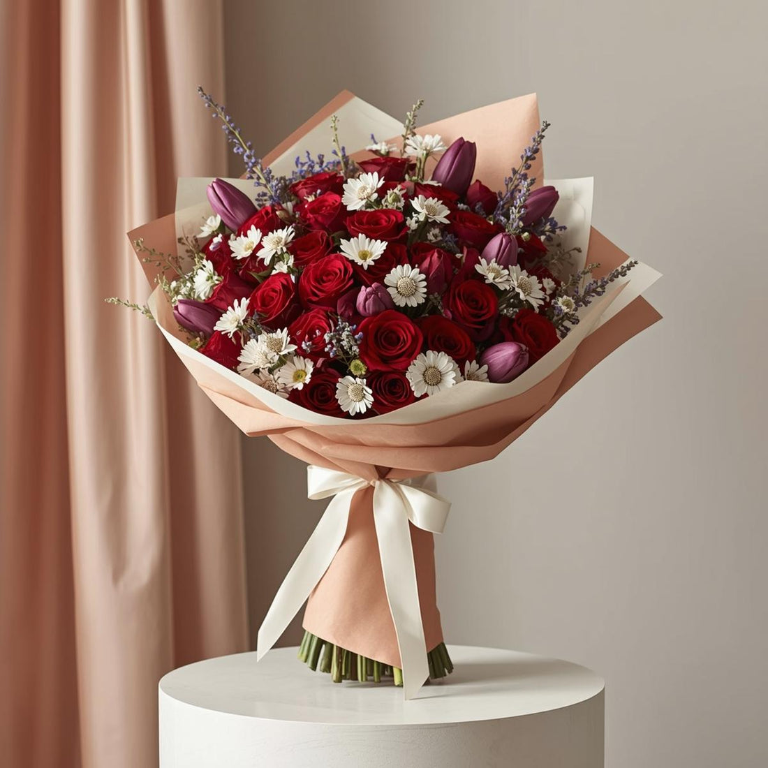 30 red roses with 10 purple tulips and 5 stems of chamomile, wrapped in matted...