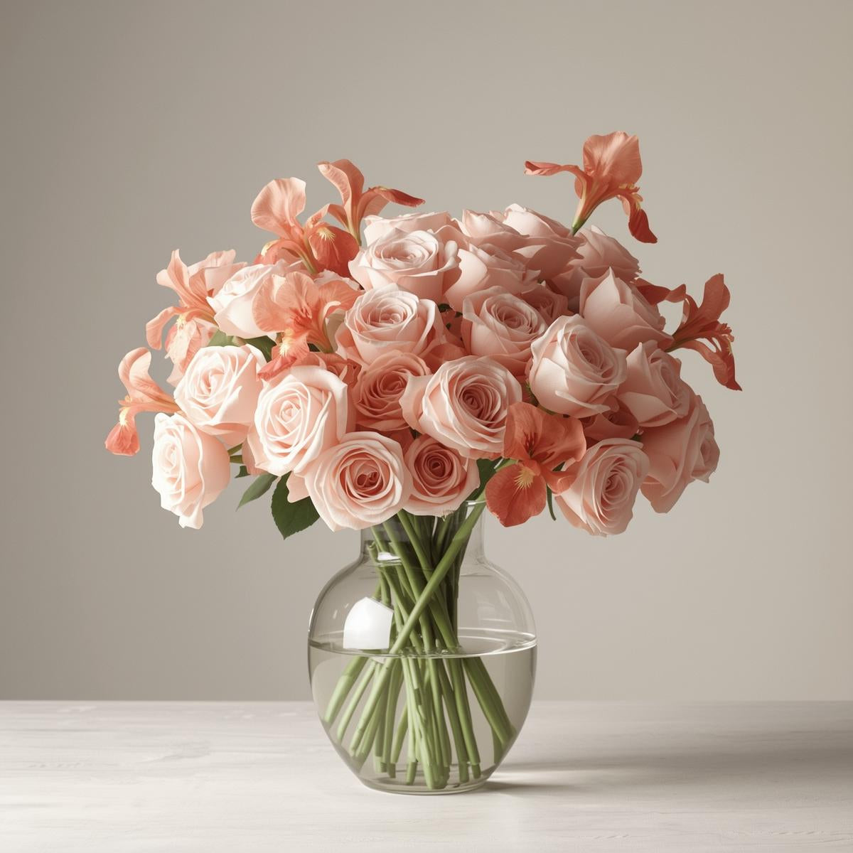 15 pink roses and 7 coral iriss arranged in a clear glass vase.
