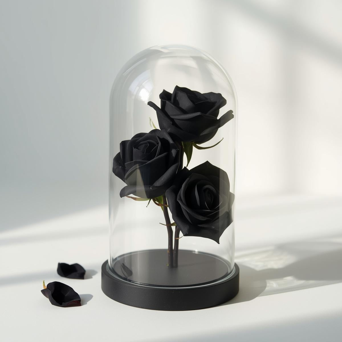 trio preserved black roses displayed in a glass dome — an eternal keepsake.