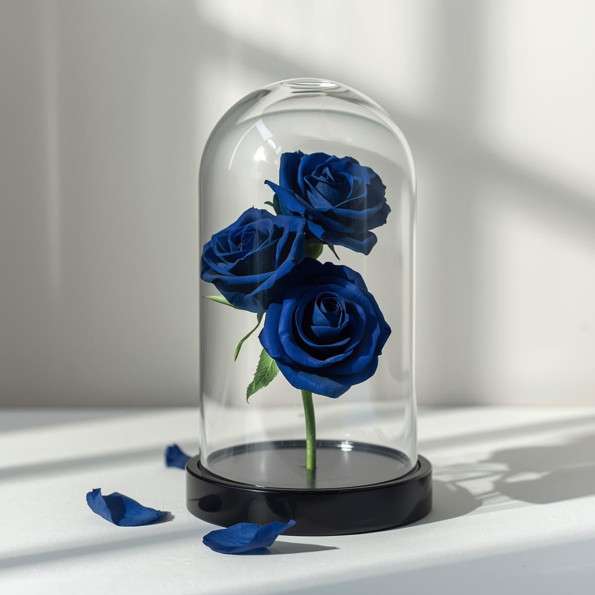 trio preserved blue roses displayed in a glass dome — an eternal keepsake.