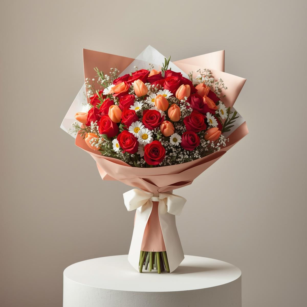 40 red roses with 10 orange tulips and 5 stems of chamomile, wrapped in matted peach and white paper with white ribbon.