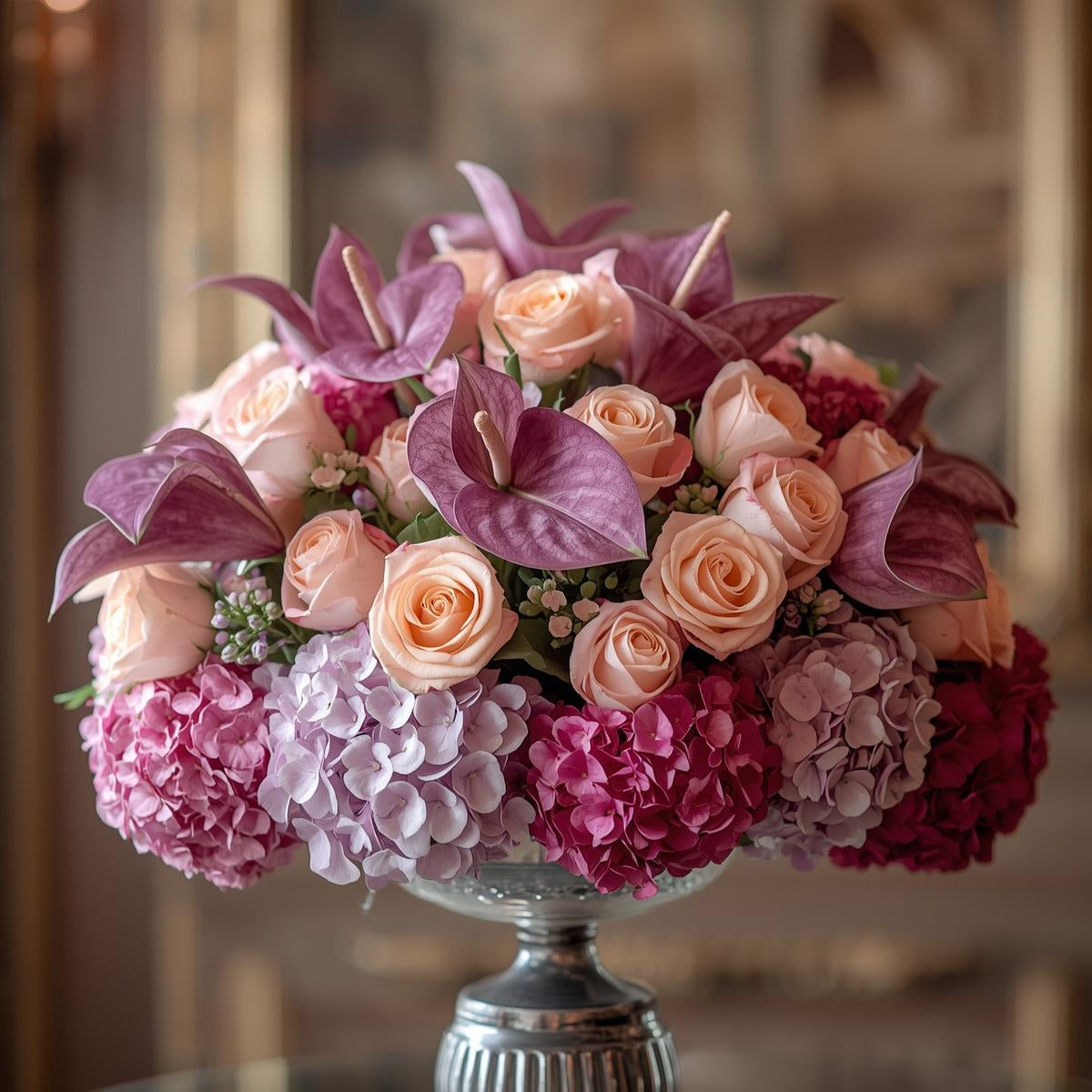 4 lavender anthuriums, 6 peach roses, and 10 fuchsia hydrangeas arranged as a grand centerpiece.