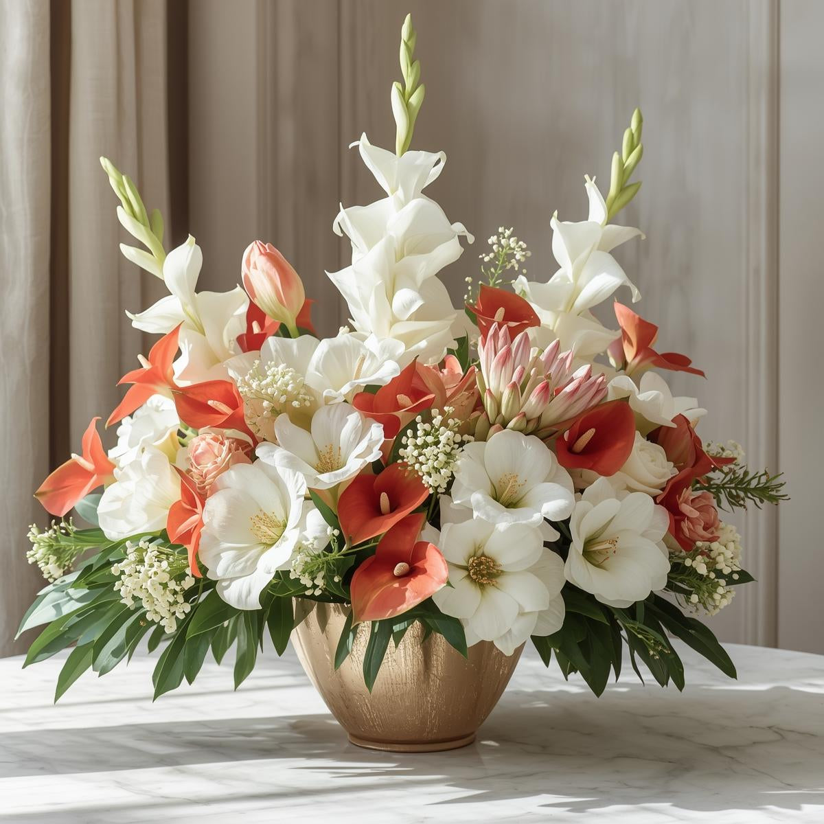 3 white delphiniums, 7 ivory proteas, and 8 coral anthuriums arranged as a grand centerpiece.