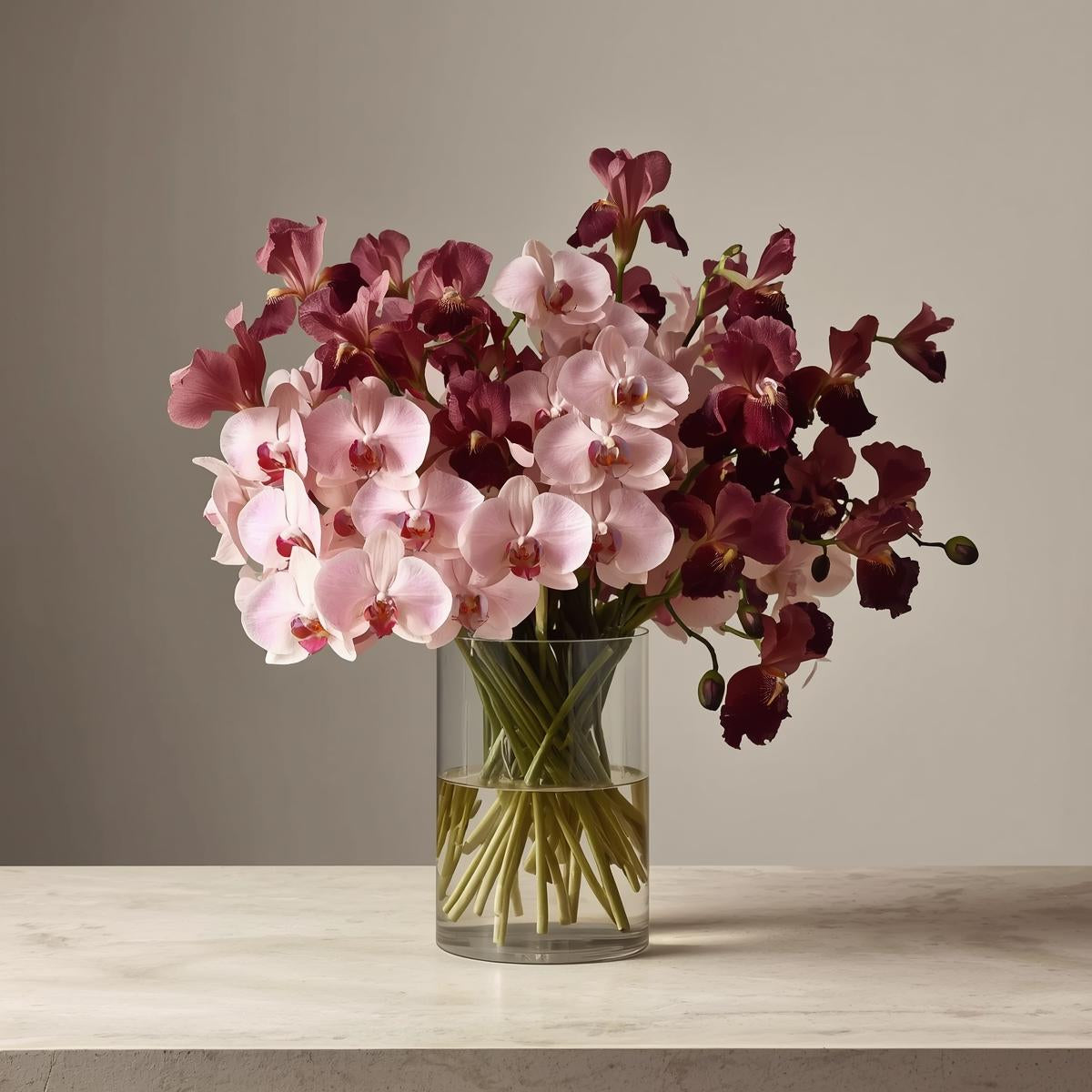 20 pink orchids and 9 burgundy iriss arranged in a clear glass vase.