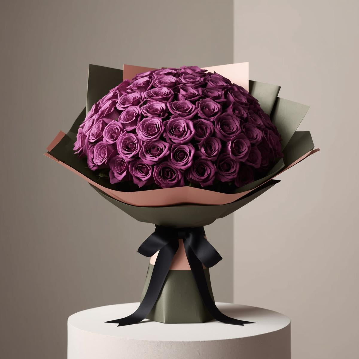 50 purple roses wrapped in matted green and peach paper with black ribbon.