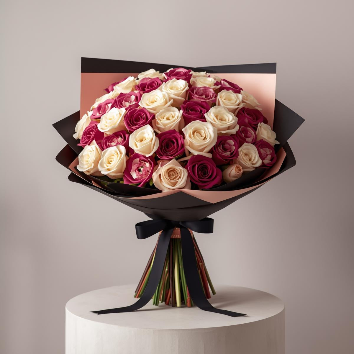 20 mixed roses (fuchsia and white) wrapped in matted black and peach paper with black ribbon.