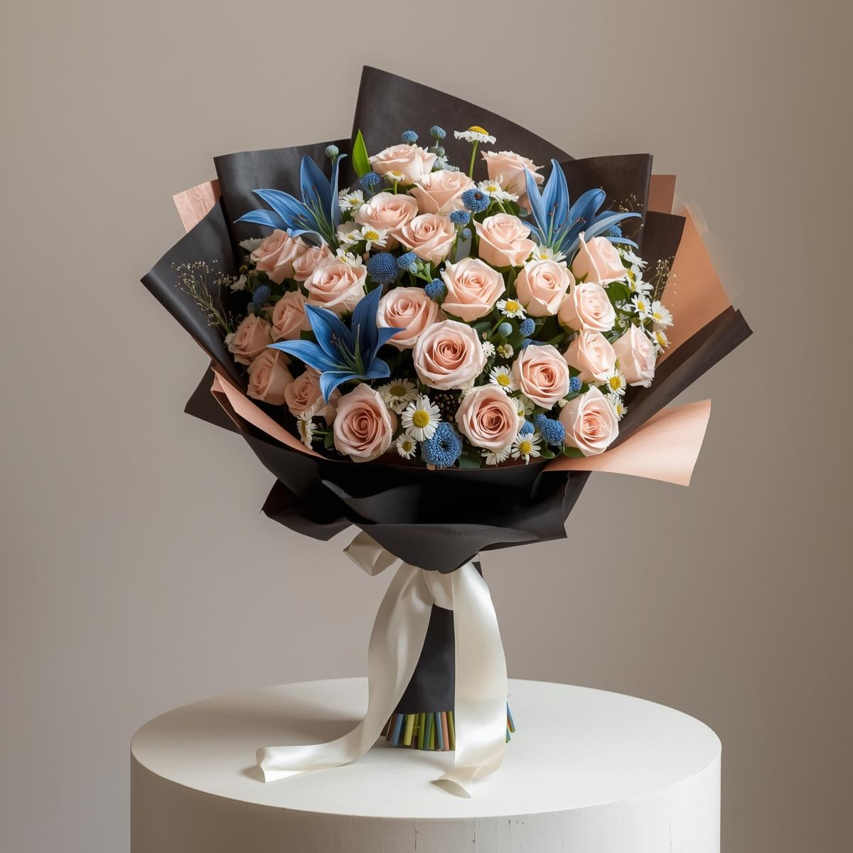 30 pink roses with 10 blue lilys and 5 stems of chamomile, wrapped in matted black and peach paper with white ribbon.