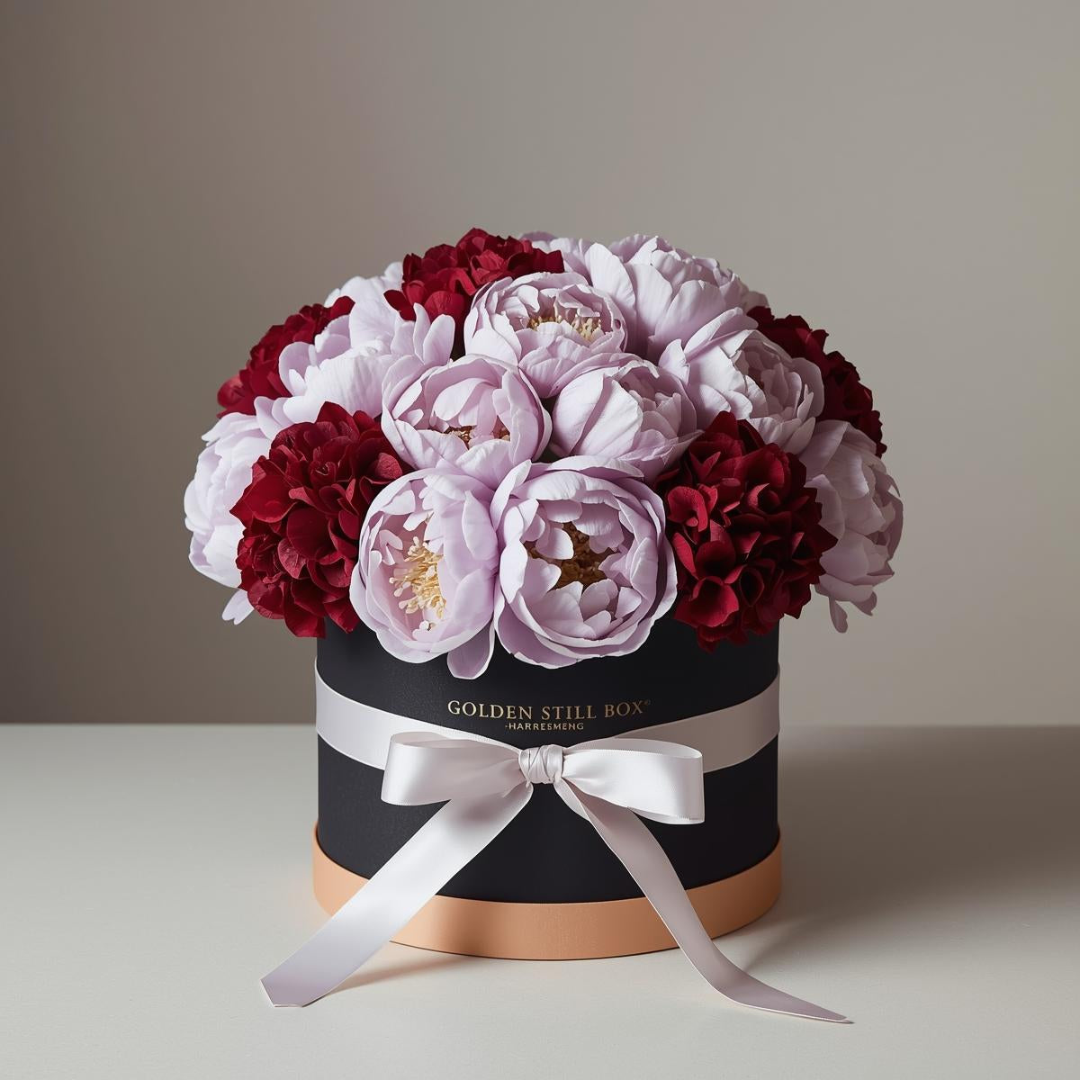 28 lavender peonys and 6 red hydrangeas curated in a round hatbox, wrapped in matted black and peach paper with white ribbon.