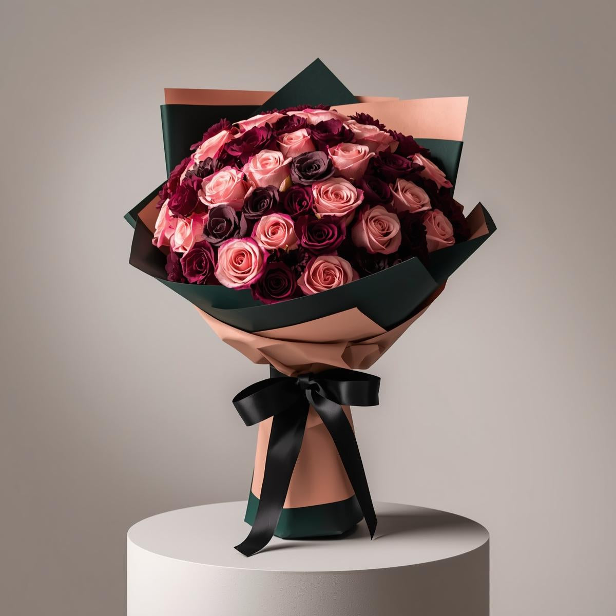 50 mixed roses (pink and purple) wrapped in matted green and peach paper with black ribbon.