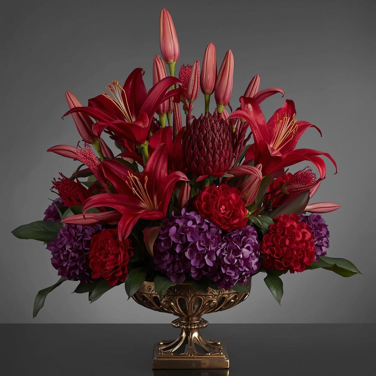 2 red lilys, 7 red proteas, and 10 purple hydrangeas arranged as a grand centerpiece.