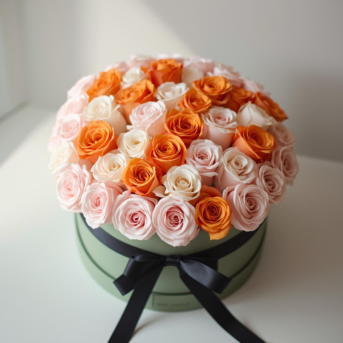 20 pink carnations and 8 orange roses curated in a round hatbox, wrapped in matted green and white paper with black ribbon.
