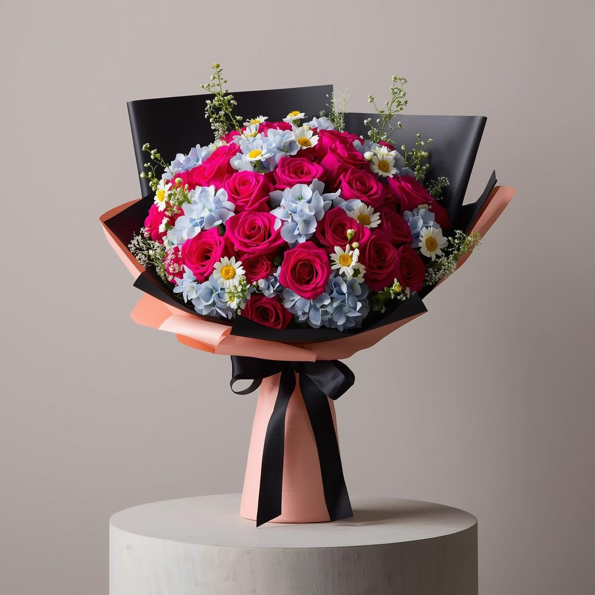 40 fuchsia roses with 10 blue hydrangeas and 5 stems of chamomile, wrapped in matted black and peach paper with black ribbon.