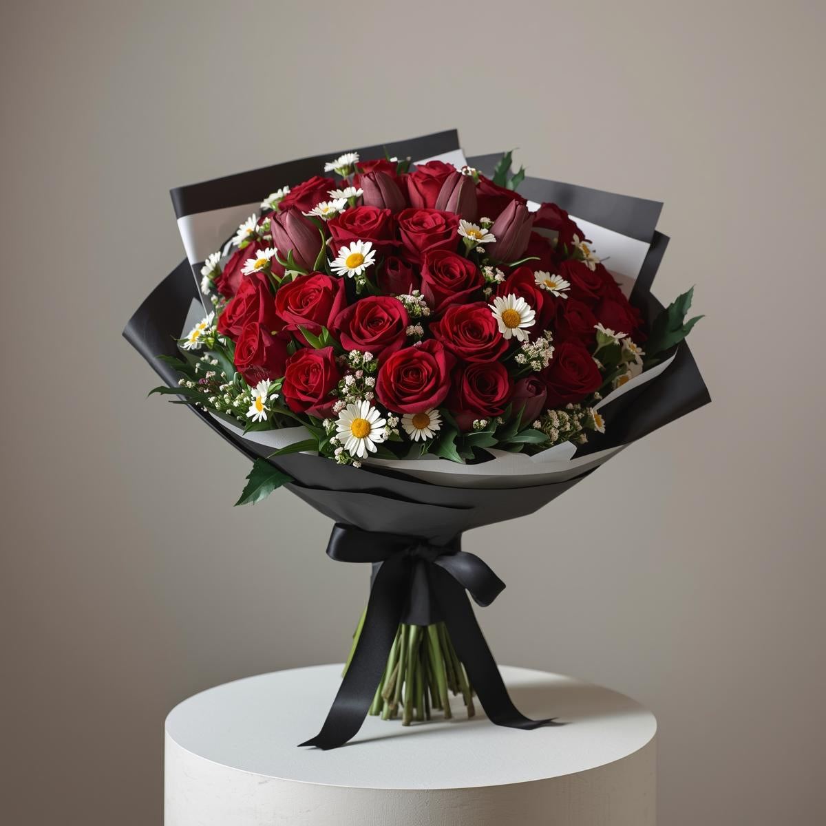 20 red roses with 10 burgundy tulips and 5 stems of chamomile, wrapped in matted black and white paper with black ribbon.