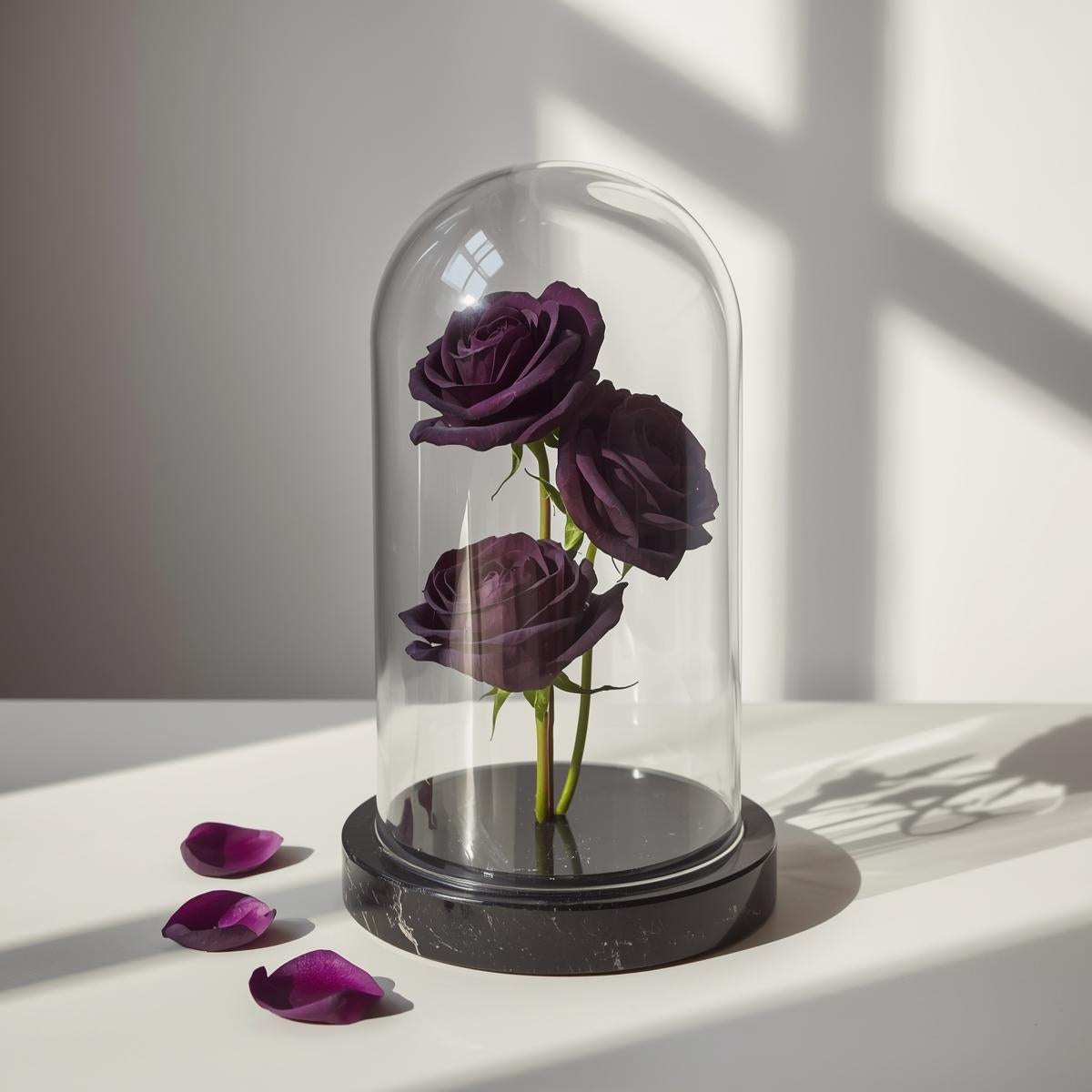 trio preserved purple roses displayed in a glass dome — an eternal keepsake.