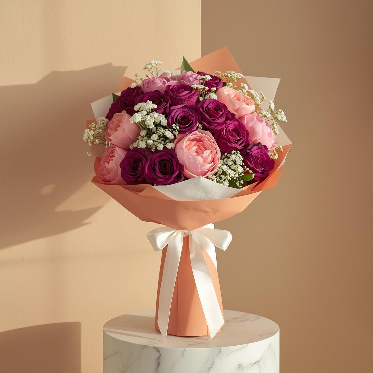 35 purple roses with 10 fuchsia peonys and 5 stems of gypsophila, wrapped in matted peach and white paper with white ribbon.