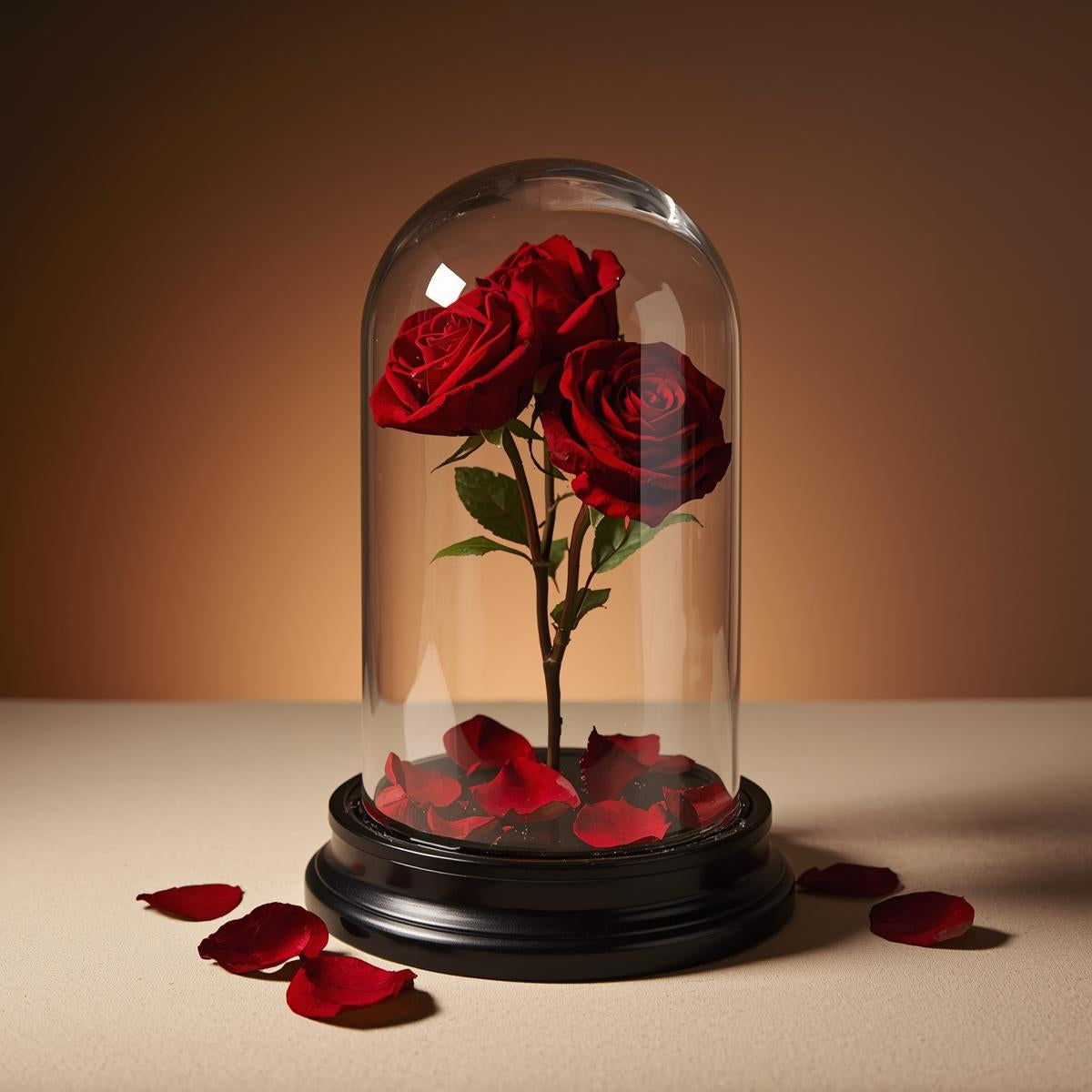 trio preserved red roses displayed in a glass dome — an eternal keepsake.