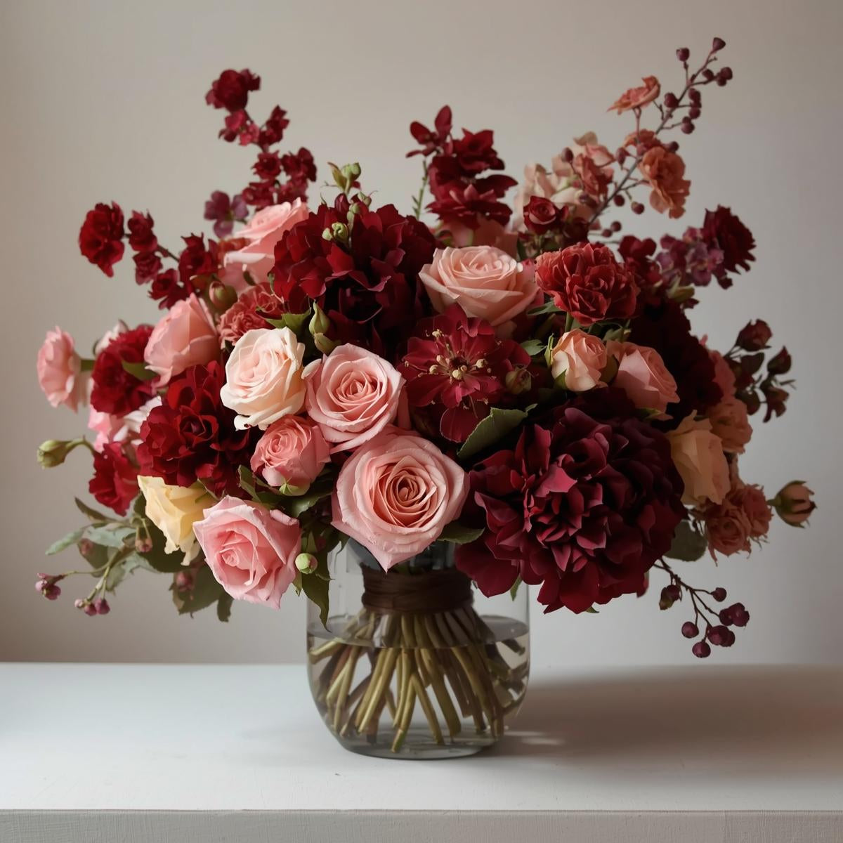 20 burgundy mathiolas and 5 burgundy hydrangeas arranged in a clear glass vase.