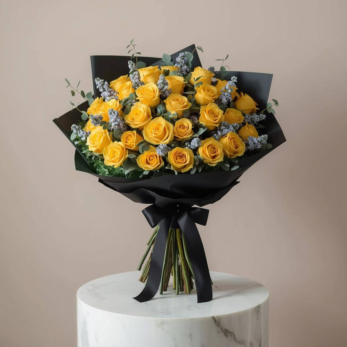25 yellow roses with 10 lavender eustomas and 5 stems of eucalyptus, wrapped in matted black and green paper with black ribbon.