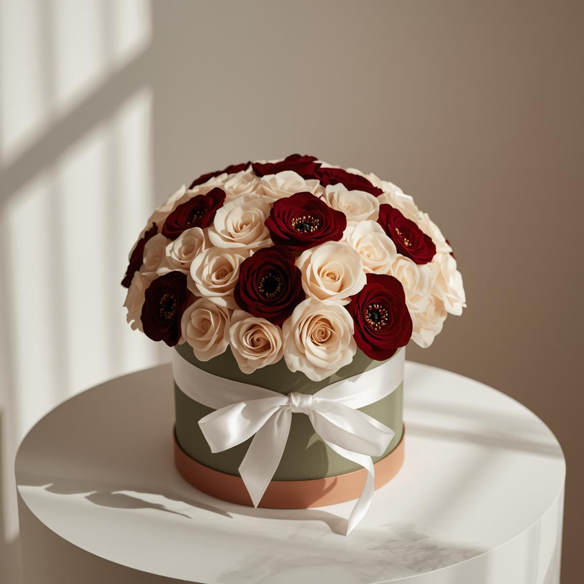 16 peach wax flowers and 8 burgundy eustomas curated in a round hatbox, wrapped in matted green and peach paper with white ribbon.
